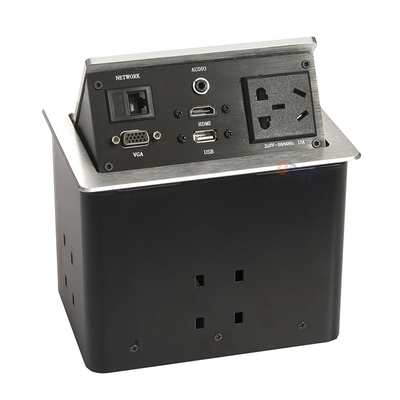 La caja de toma de corriente de la mesa está compuesta por un panel de aluminio, una caja de acero y una placa de conexión.El usuario presiona el panel de la superficie para liberar el bloqueo fijo en el interiorDespués de usar la caja de toma de corriente manual, simplemente presione la cubierta del panel,el dispositivo de bloqueo mecánico dentro del enchufe del escritorio bloqueará la cajaLa caja de conexión con llave se coloca junto a la mesa y todas las conexiones se ocultan con destreza. La parte superior ordenada y elegante de la caja junto con la mesa forman una masa integrada.Todos los cables están conectados con el panel de conexión inferior directamente, fácil de instalar, muy conveniente para la conferencia de oficina.